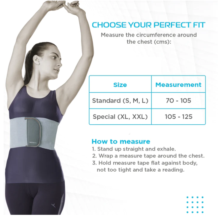 - Offers ideal post operative care, protects and binds the surgical incisions and also allows sufficient flexibility and comfortable breathing.