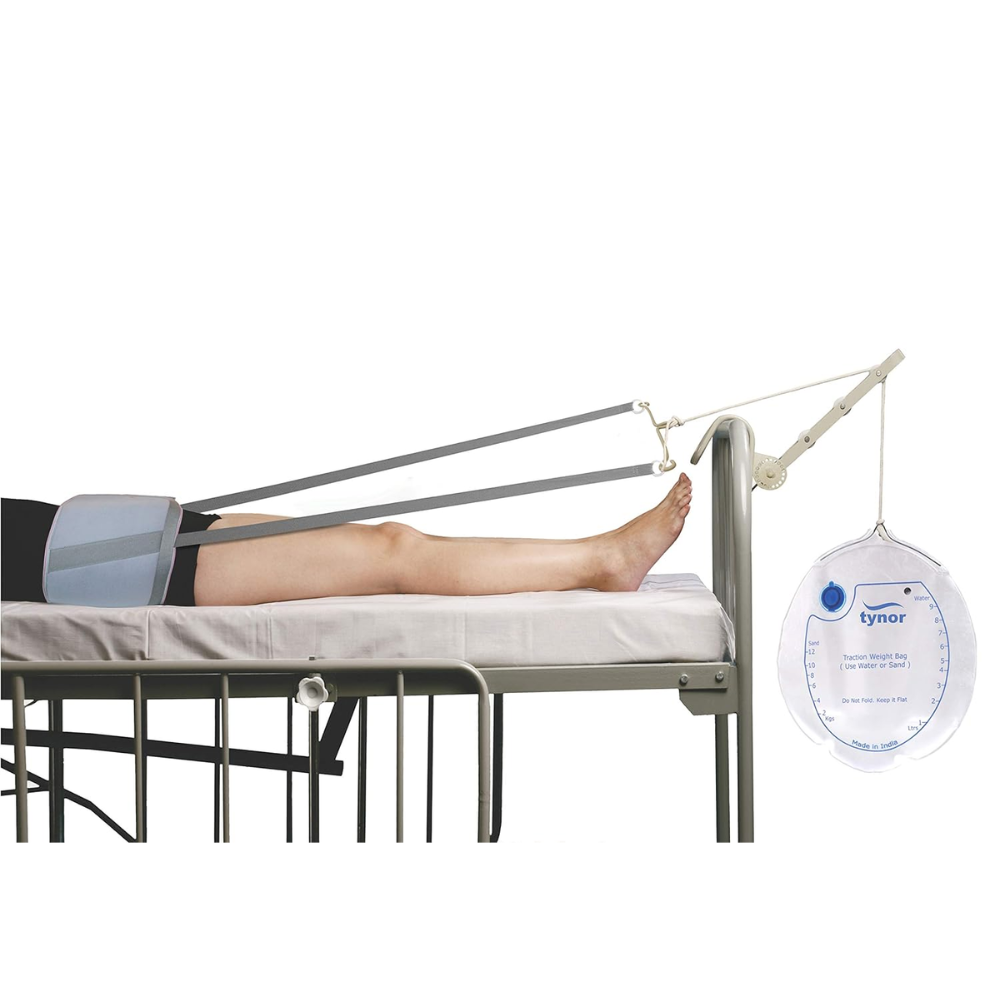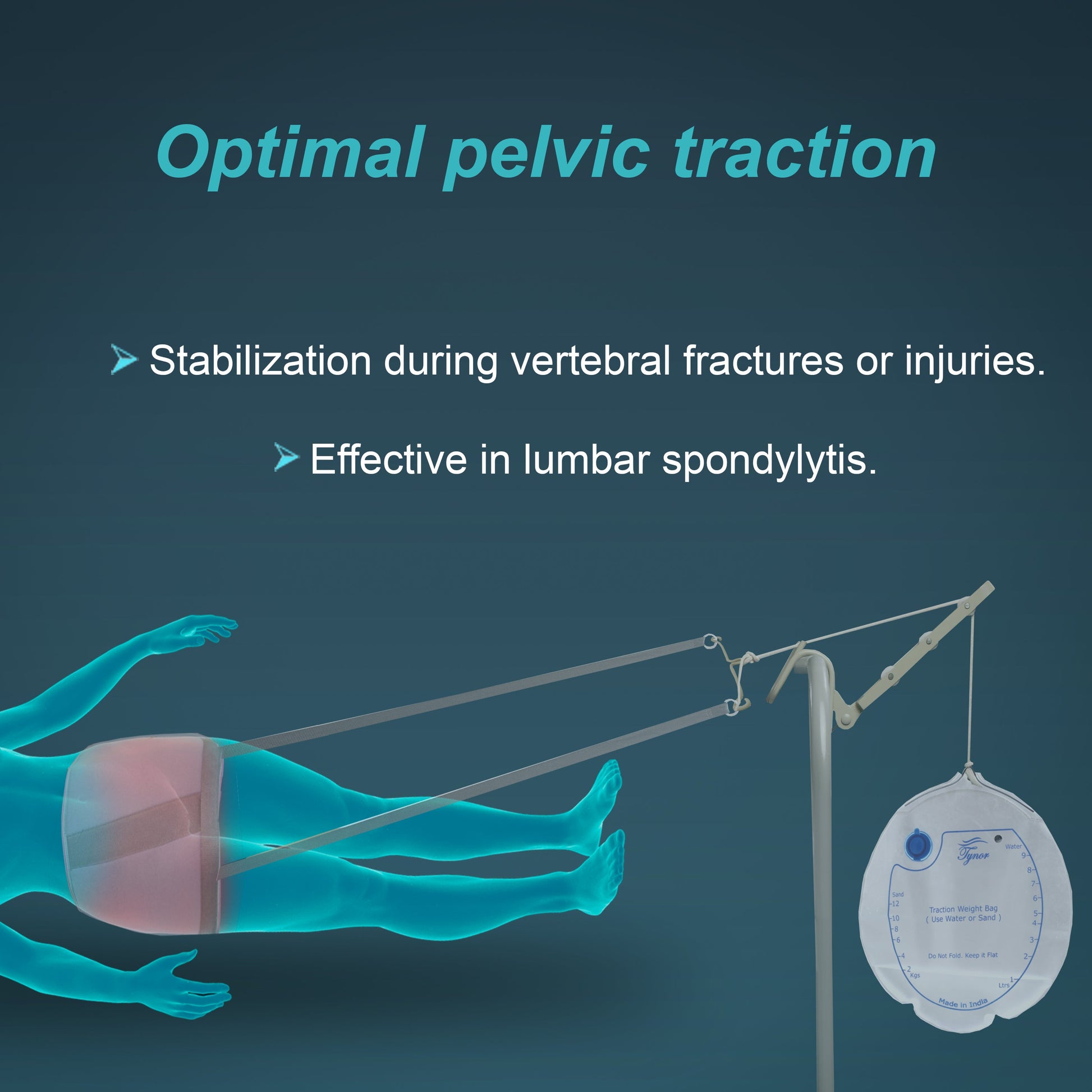 Pelvic traction belt is a traction halter which holds the pelvic area and pulls the sacral, lumbar and thoracic areas of the vertebral column. Pelvic traction belt through the slingg on the two sides get attached to the spreader bar, traction pulley bracket and the weights.