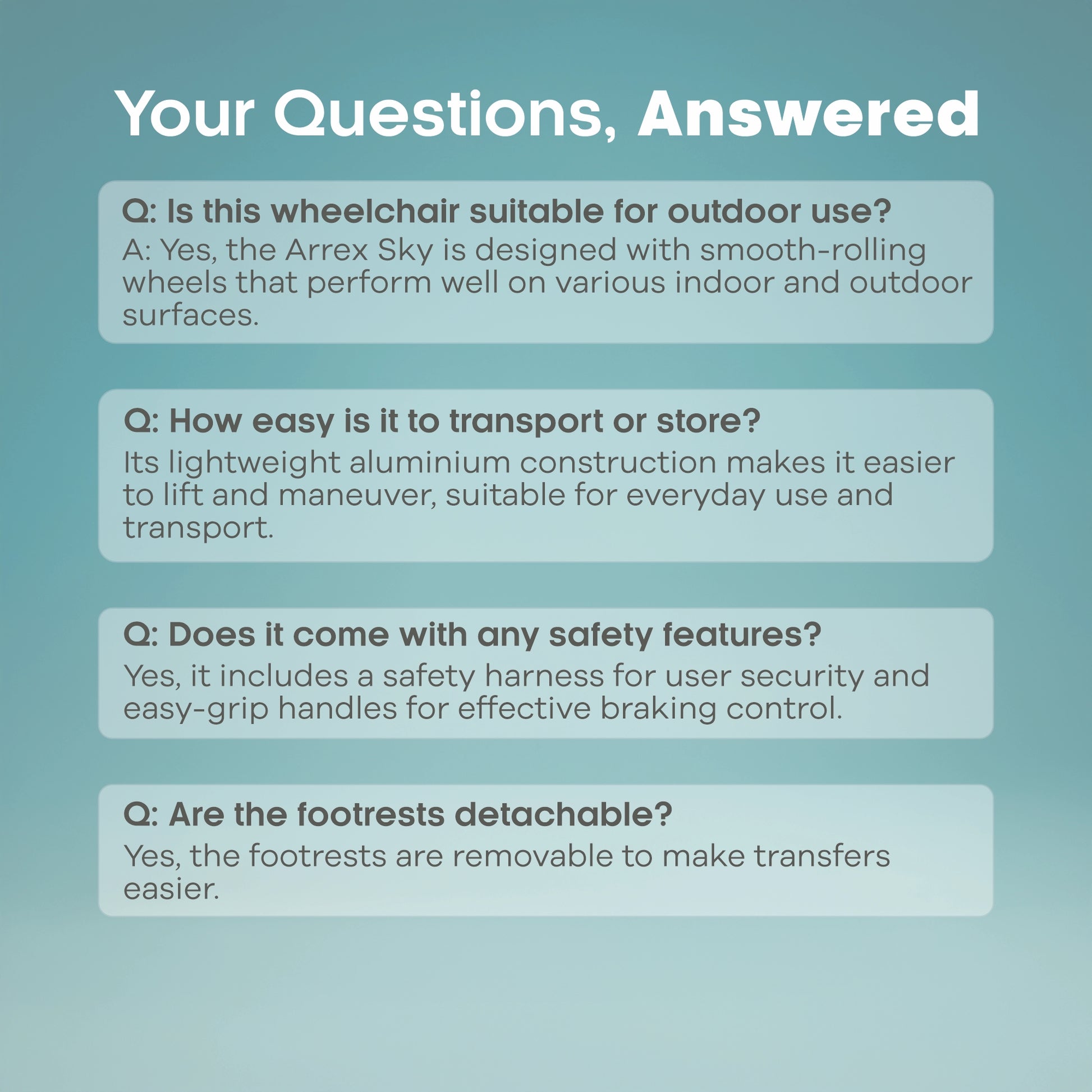 Ideal for home care, hospitals, and rehabilitation settings, the ARREX Sky Premium Aluminium Wheelchair is a dependable mobility solution for users seeking comfort, stability, and ease of use in everyday life.